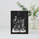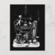 skeleton band vintage postcard: here we have black and white vintage death art from 1850, a skeleton sits with skeleton instruments including a guitar a horn and a harp other skulls and bones as well as an hourglass set the scene. Drapes are parted above.
