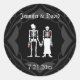 Skeleton Couple Save the Date Sticker Labels. A great pair of skeletons that represent the bride & groom, holding red hearts ontop of a flourish background.