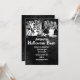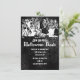 Skeleton Halloween Party Invitations with a group of skeletons dancing and having a party at the top of the invitation. The background is black and grey with flourish prints in the background. It reads "Join us for a Halloween Bash" in a creepy font style. Just add your Halloween Party details to this invitation template. This could also be used for Day of the Dead Invitations. Halloween wedding invitations also available: