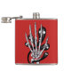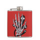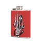 Skeleton hand flask featuring a graphic illustration of a hand of a skeleton with black spooky ghosts with glowing eyes swirling around it over customisable deep red background.