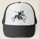A skeleton wearing a hat and holding a spear riding a skeleton horse.