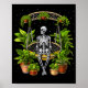 This botanical gardening design features a skeleton botany lover surrounded by house plants.