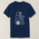 Monochrome skeleton drummer with bold lines and a full drum kit, perfect for alt fashion and Halloween collections; high contrast, energetic, playful yet edgy.