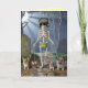 A cute dog greeting card featuring a skeleton walking his small dogs in a graveyard.
