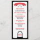 Offbeat rocker wedding program featuring two skeletons, a coffin, and fun symbols.