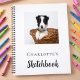 An elegant white background. Personalise and add your own photo of your dog or pet. Add your name and a title. The title is written with a modern hand lettered style script. Black coloured letters. A notebook for sketching your dog, taking notes or for school homework.