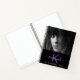 A chic black background. Personalise and add your own photo, a name, monogram letter and a year. The name is written in white with a large modern hand lettered style script with swashes. The monogram letter in purple. For school, work as a sketchbook, diary and journalling. To keep the swashes only delete the sample name, leave the spaces or emoji's in front and after the name