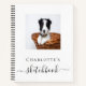 An elegant white background. Personalise and add 2 of your own photo of your dog or pet. Add your name and a title. The title is written with a modern hand lettered style script with swashes. Black coloured letters. A notebook for sketching your dog, taking notes or for school homework.