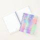A trendy holographic, iridescent coloured background with unicorn and rainbow pastel colours in pink, purple, rose gold, mint green. Decorated with rainbow coloured falling stars. Personalise and add a name, The title: sketchbook written with a girly modern hand lettered style script with swashes. Purple coloured letters. A notebook for drawings, sketching, notes and school homework.