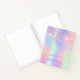 A trendy holographic coloured background with unicorn and rainbow pastel colours in pink, purple, rose gold, mint green. Decorated with pink faux glitter dust. Personalise and add a name, The title: sketchbook written with a girly modern hand lettered style script with swashes. Purple coloured letters. A notebook for drawings, sketching, notes and school homework.