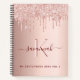 A faux rose gold metallic looking background with elegant rose gold and pink faux glitter drips, paint dripping look. Personalise and add a name, monogram letter and a title. The name is written in burgundy with a large modern hand lettered style script with swashes. Perfect for school, as a sketchbook or for taking notes.