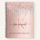 A faux rose gold metallic looking background with elegant rose gold, pink faux silver glitter drips, paint dripping look. Personalise and add a name, monogram letter and a title. The name is written in burgundy with a large modern hand lettered style script with swashes. Perfect for school, as a sketchbook or for taking notes.