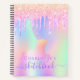 A trendy iridescent colored background with unicorn and rainbow pastel colors in pink, purple, rose gold, mint green. Decorated with faux glitter drips in rose gold, pink, purple and a rainbow colored unicorn. Personalize and add a name. The title: Sketchbook is written with a trendy hand lettered script with swashes. To keep the swashes only delete the sample name, leave the spaces or emoji's in front and after the name.