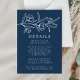 Elegant floral wedding details cards featuring white sketched flowers and leaves near the top of the design with a navy background. Personalise the botanical wedding details cards with your wedding details below in classic white lettering. Designed to coordinate with our Sketched Floral wedding collection.