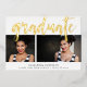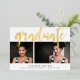 A modern graduation announcement featuring two of your favourite senior portraits or graduation photos aligned side by side, with "graduate" overlaid in gold foil hand sketched lettering. Personalise the front side with the graduate's name, school and class year, and add a personal message to the back.