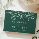 Elegant floral wedding guest book featuring sketched white flowers and leaves near the top of the design with a dark green background. Personalise the botanical wedding guest book with your names and wedding details below. Add custom text to the spine such as your names, wedding date, etc. The back of the floral guest book features your horizontal engagement photo. Designed to coordinate with our Sketched Floral wedding collection.