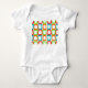This baby bodysuit has a mid-century modern design of repeating skewed rectangles in red, orange, green, and turquoise.