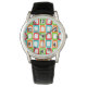 This men's watch has a mid-century modern design of repeating skewed rectangles in red, orange, green, and turquoise.