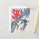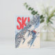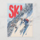 An exhilarating winter scene captures skiers carving down a steep, snow-covered mountainside above a colourful alpine village. Crisp white snow contrasts with deep blue shadows and towering frosted trees, while bold red lettering adds dynamic energy to the composition. The dramatic angle and sense of motion evoke speed, freedom, and the thrill of downhill skiing in a breathtaking mountain setting.