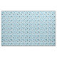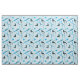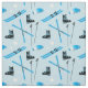 Fun fabric featuring skiing equipment including skis, boots, goggles and poles. All patterned over a pale blue background.