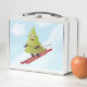 Cute winter metal lunch box with a funny illustration of a smiling happy pine tree which loves to ski downhill in the winter. It has lovely red ski and is descending with high speed over a snowy slope. The blue sky is clear and a few white clouds only brighten it more. Snowflakes are everywhere. This cute pine tree illustration will appeal to someone who loves ski and the winter season. This winter design will make a great Christmas gift, too.