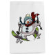A cheerful gift bag for a Christmas present, featuring an over excited snowman dashing through the snow on skis, in woolly winter hat and tartan scarf. An upbeat image for Christmas.