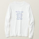 I love this shirt. I had written to the artist asking her if this picture was available on a shirt, and she wrote me back telling me where I could find the shirt. These shirts can be custom made to have a different saying. I loved this saying and went with it. The artist wrote me back later to tell me that she had seen my order go through. How's that for service? Pretty special. It's just as displayed. Perfect!