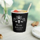 Serve drinks in spooky style with these black and white Halloween paper cups. Featuring a bold skull silhouette, flying bats and a decorative flourish with personalizable text areas. Perfect for creating a festive table setting for Halloween parties.