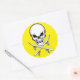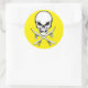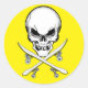 Round sticker with skull and cross bones - with the bones converted to skateboards - for a unique, iconic twist, against a bright yellow background. Collect them all.