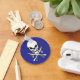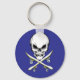 Design with a grinning skull and crossed skateboards instead of bones against a deep blue background.