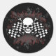 Jolly racing skull and crossbones with chequered flags on splatter.