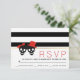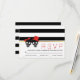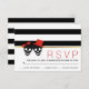 Skull couple and bblack and white stripes red Halloween wedding RSVP reply card. This design includes a black and white striped pattern, the skull bride with a red bow and the groom with a red hat and your text.