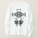 Tribal Tattoo style cross with twin flaming skulls with fangs is a unique design for all light coloured apparel.