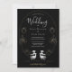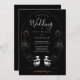 A stylish, gothic, wedding invitation in black, gold tones, and white. It features the couple represented as two skulls in a floral frame with roses. This invitation mixes a memorable mood with elegance, letting you design your wedding as you choose. Simply customise the text, add this invitation to your cart, then have a wedding that sees past the surface and cuts to what’s beneath.