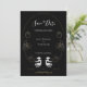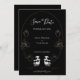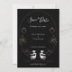 A stylish, gothic, wedding Save the Date in black, gold tones, and white. It features the couple represented as two skulls in a floral frame with roses. This Save the Date card mixes a memorable mood with elegance. Simply customise the text, add this card to your cart, then let your guests know that it’s time.
