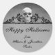A scary sticker for the spookiest of holidays! A Victorian-style border topped by a skull highlights your Halloween message. It sits against a moody black and grey background. Set the mood for fright and hold onto someone tight! Great as envelope or package seals or closing trick or treat favour bags. Available in alternate background colours with matching postage and invitations.