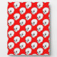 A pattern of white skulls on a red background. Original design with newsprint effect. Black, white and red cartoon image.