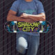 Central Motif: A meticulously detailed skull featuring Ukiyo-e-inspired floral and wave patterns, layered with graffiti typography (“Shadow City”).