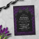 Skulls and bow wedding invitation for a goth wedding with a black skull damask on a deep red background. Your goth wedding invitation wording is written with a gothic font and an elegant script on a tomb-shaped black background adorned with a black bow with ribbons hanging down the side to frame the tomb.