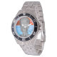 Has heft and feel of expensive stainless steel quartz watches. Good band with safety catch. I removed links, which is easy because engraved arrows show direction to push the linking pins. As always by this seller, the image (a railroad logo) is a perfect reproduction of my emailed image, and is precisely spaced and aligned.
