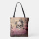 Embrace the eerie elegance of Halloween with this captivating themed tote bag. The elaborate background features a mesmerising combination of red roses, ornate iron scrollwork, and pink and beige old paper with mysterious writings. Against this haunting backdrop, a creepy yet beautiful decorated skull takes centre stage, adorned with striking blue and golden roses.