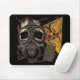 Apocolyptic design of a skull wearing gasmask / respirator, with biohazard sign in background. Design done in urban or grunge style. Blood spatters and barbed wire coil also in background.