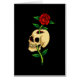 A classic vintage tattoo art image of a skull with the stem of a red rose growing through it.