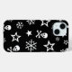 Skull and crossbones with pretty snowflakes and stars against a black background.