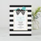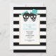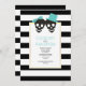 Skull couple and black and white stripes aqua Halloween wedding invitation. A fun black skull couple with an aqua blue bow and hat paired with an elegant black and white striped pattern border are the elements of this modern invitation.