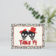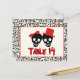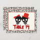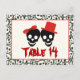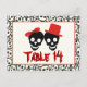 Elegant skulls Halloween red black wedding Table number card, featuring a black skull couple bride and groom on ivory background and a skull pattern border. The groom wears a red hat and the bride a red bow.