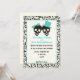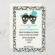 Elegant skulls Halloween turquoise wedding invitation, featuring a black skull couple bride and groom on ivory background and a skull pattern border. The groom wears a turquoise blue hat and the bride a turquoise blue bow.