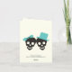 Elegant skulls Halloween turquoise wedding invitation, featuring a black skull couple bride and groom on ivory background and a skull pattern border. The groom wears a turquoise blue hat and the bride a turquoise blue bow.