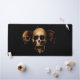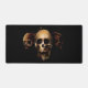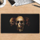 Three human skulls set against a backdrop of black. A little critter is peeking out over the middle skull