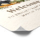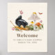 Nature storybook page inspired baby shower welcome featuring illustration of a skunk sitting on a leaf in the grass with two mushrooms, butterflies, and flowers.